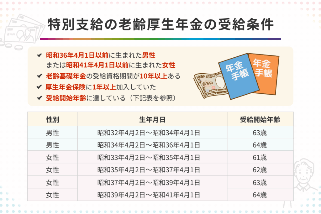 老齢厚生年金の支給対象者には、次の条件があります: