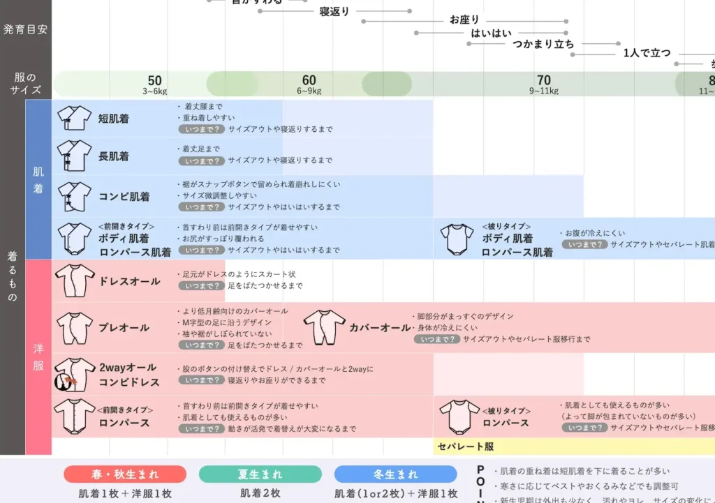 赤ちゃんの年齢に応じたコンビ肌着の選び方は次の通りです。