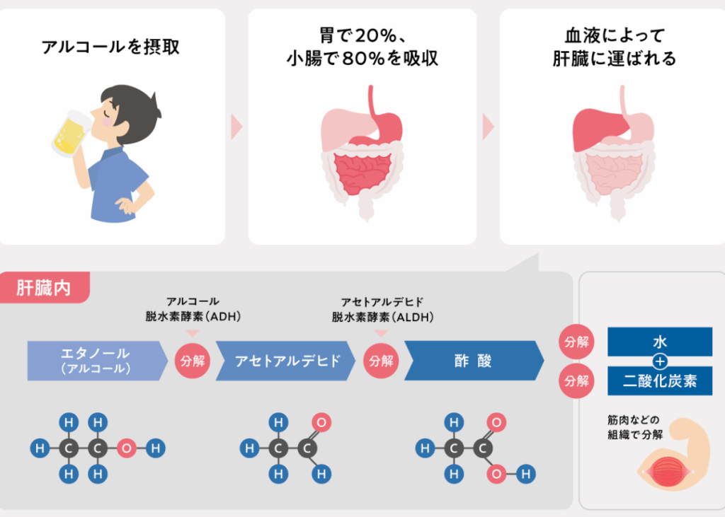 肝臓はアルコールの代謝の中心です。主要な酵素であるアルコール脱水素酵素(ADH)がアルコールをアセトアルデヒドに変え、その後アセトアルデヒド脱水素酵素(ALDH)によって、さらに無害な物質に分解されます。主な過程を以下に示します: