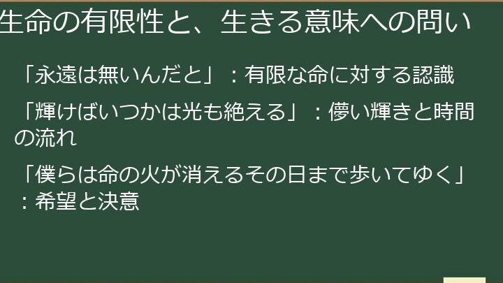 このようなメッセージは、聴く者の心に直接響き、感動を呼び起こします。また、歌詞には深い思索が隠されており、聞くたびに新しい解釈が見つかります。