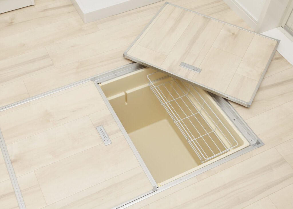 扉付きの床下収納は、簡単に開閉できるデザインが特徴です。これにより、収納物にアクセスしやすく、整理整頓がしやすいです。扉を持つことで、埃の侵入を防ぎ、物の劣化を抑える役割も果たします。また、多様なサイズとスタイルがあるため、部屋のインテリアに合わせて選べます。
