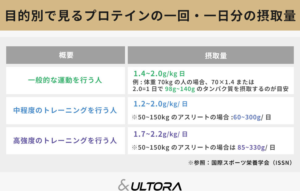 - 体重1kgあたり1.2gから2.0gのプロテイン摂取が推奨されることが多い。