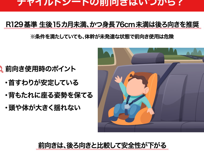 以下に、チャイルドシートを前向きに使い始める際の具体的な条件を示します。