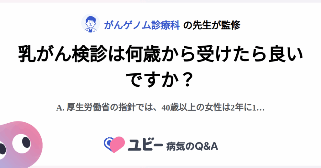 - 30代: 家族に乳がん患者がいる場合やその他のリスク要因がある場合は、35歳頃から相談することが望ましいです。