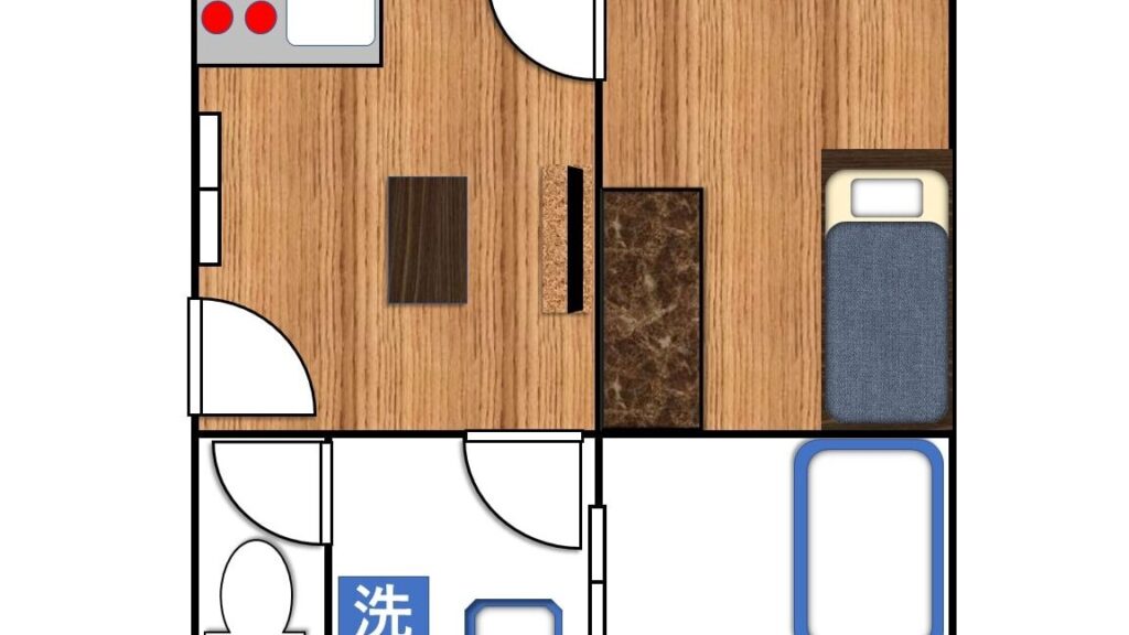 - シンプルなワンルーム: 寝室とリビングスペースが一体化しており、小型家具で効率的に配置。