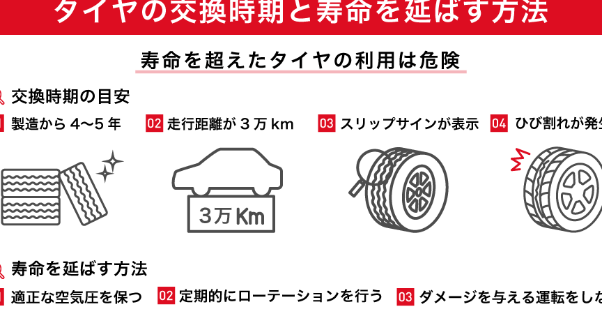 また、高速道路などで長時間走行すると熱による劣化も進みますので、その点も留意しましょう。