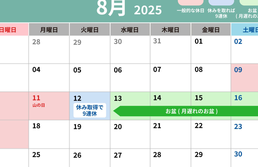 以下に、お盆休み 2025の各日にちを詳しくまとめました。
