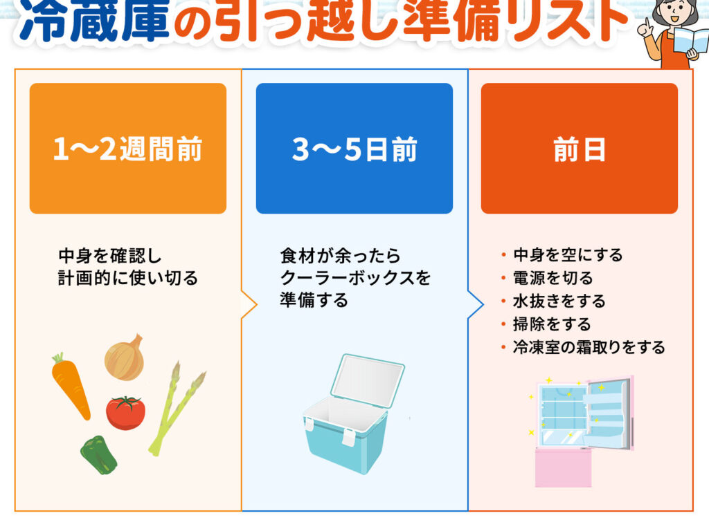 このように段階的なアプローチで行動することで、新居への移動もスムーズになります。また、冷蔵庫内が空になることで運搬中の揺れによる影響も軽減されます。
