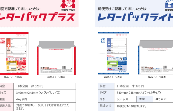- レターパックプラス: 全国一律520円で、厚さ制限なし(最大4kg)で送ることができるため、大きめの荷物にも対応しています。