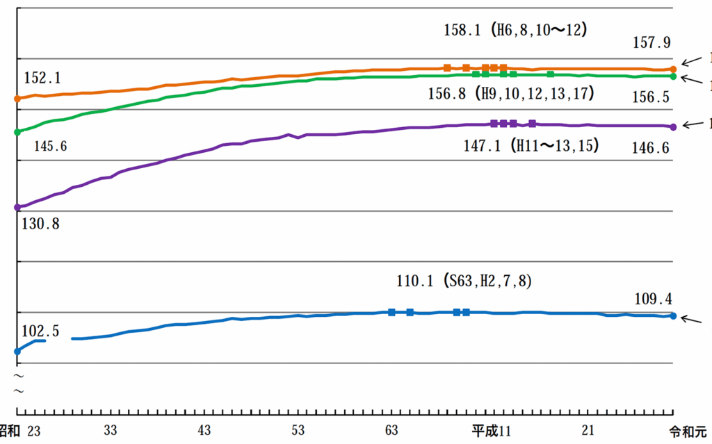 - 20代前半以降: 平均160 cm前後