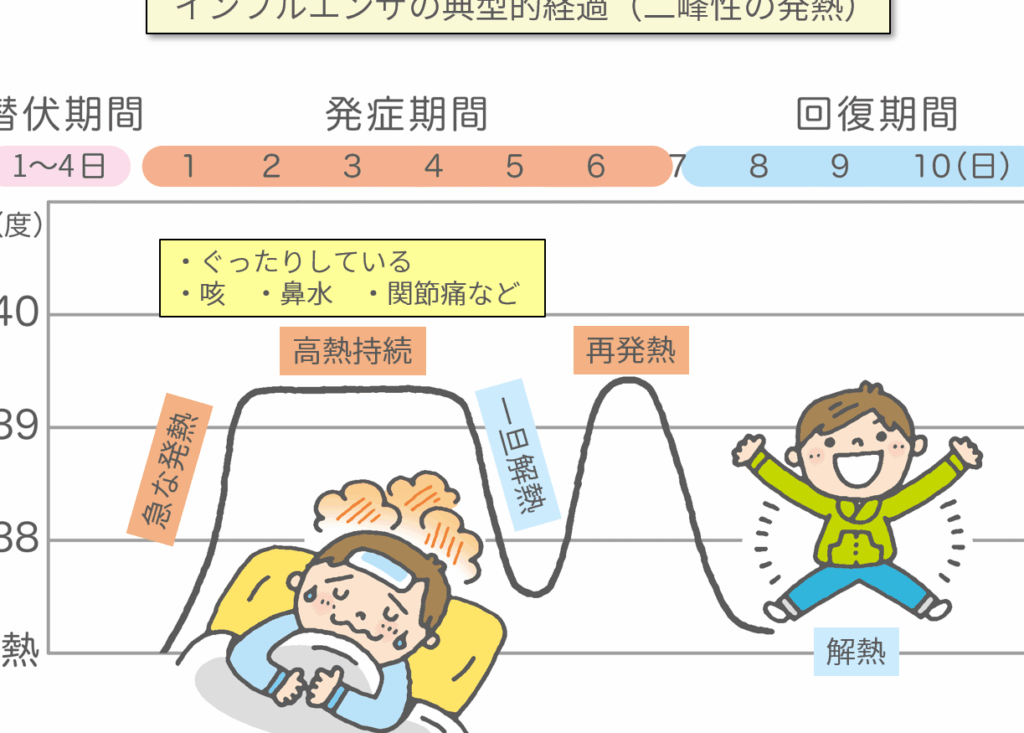 私たちの経験上、インフルエンザによる発熱はしばしば急激に始まり、高温(38℃以上)が数日間続きます。その後、一時的に症状が緩和されることもあれば、再び悪化する場合もあります。具体的には以下のようなパターンがあります: