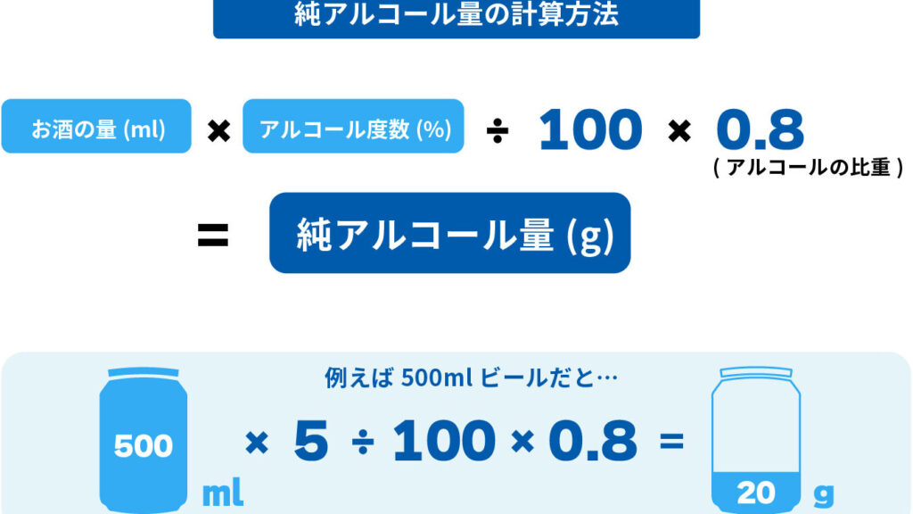 例えば、500ml のビール(一般的には約20g のアルコールを含む)を摂取した場合、このビールを完全に体外に排出するためには次のようになります: