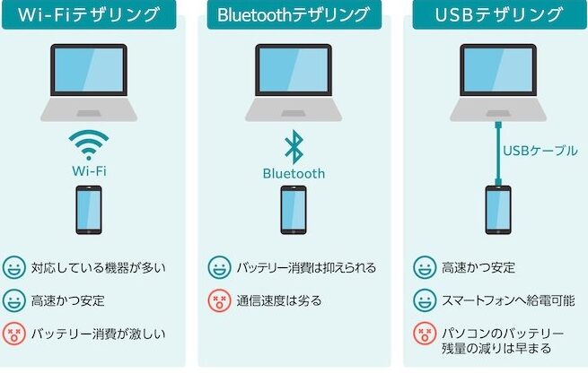 テザリングには主に3つの方法があります。それぞれ異なる接続方式であり、利用シーンによって選択できます。以下では、それぞれの方法について詳しく見ていきましょう。