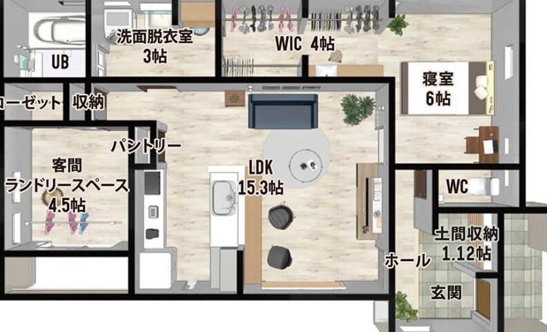 オープンフロアプランを採用することで、リビング・ダイニング・キッチンをひとつの大きな空間として利用できます。これにより、家族とのコミュニケーションが取りやすくなるだけでなく、視覚的にも広さを感じることができるメリットがあります。