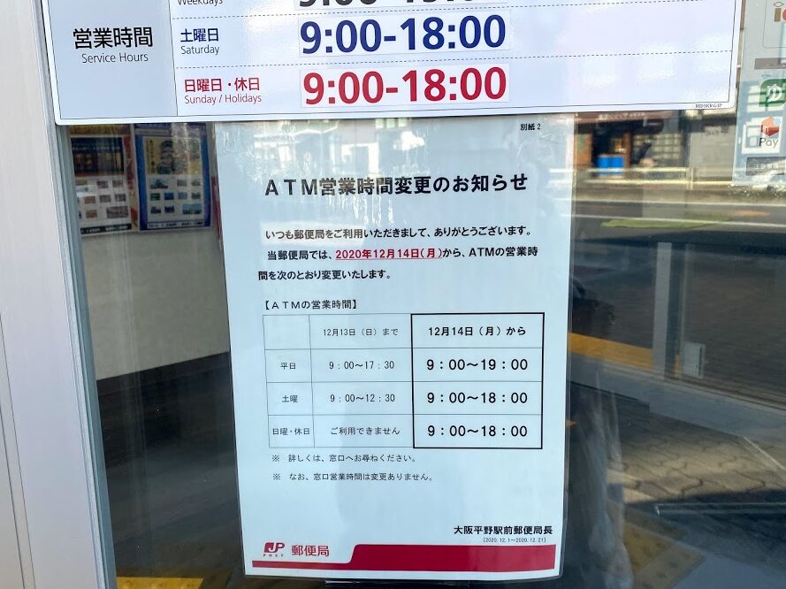 郵便局のATMは通常、以下のような時間帯で稼働しています。