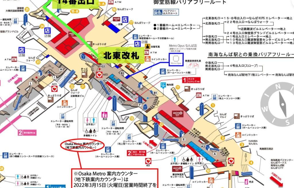 - 環状線に乗り換え、「新今宮駅」または「難波駅」で下車
