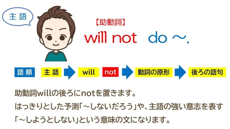 | 助動詞 | 未来形(will) + 否定形(not) |