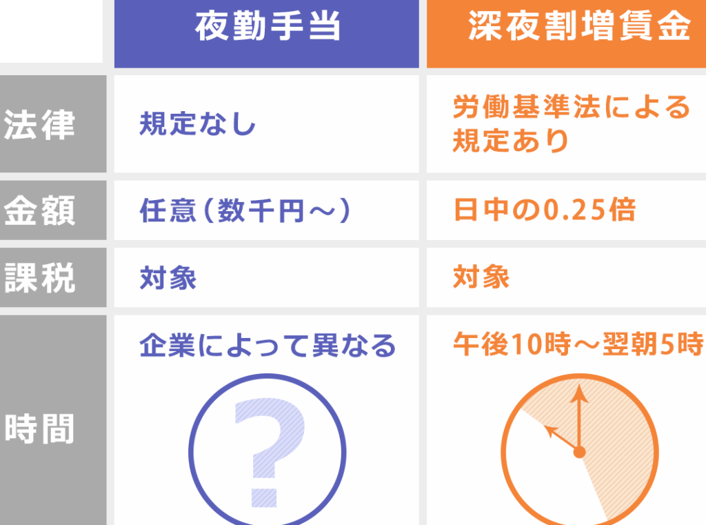 - 割増率:夜間勤務に対する追加報酬(例えば、25%や50%)。