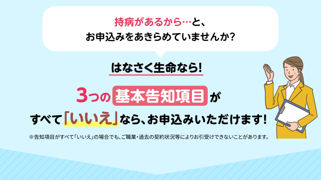 - 職業による制限: 一部、高リスク職業(例えば、高所作業員)につきましては加入できない場合があります。