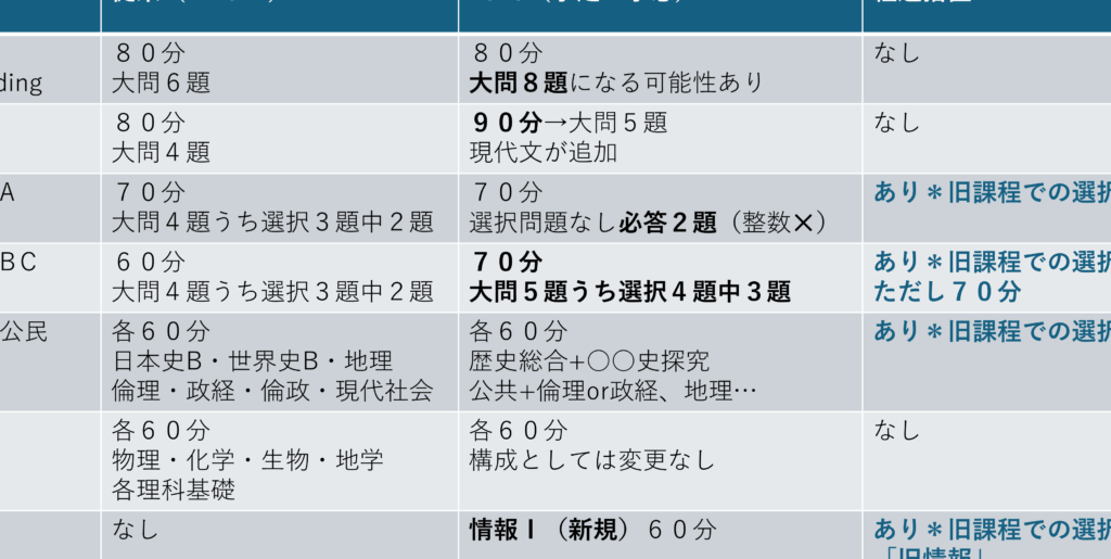 以下の表は、新しく導入される主要な試験科目についてまとめたものです。
