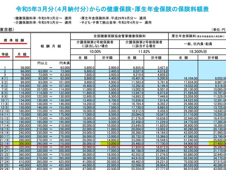 例えば、ある従業員の基本給が300,000円の場合、健康保険と年金保険について見積もると、