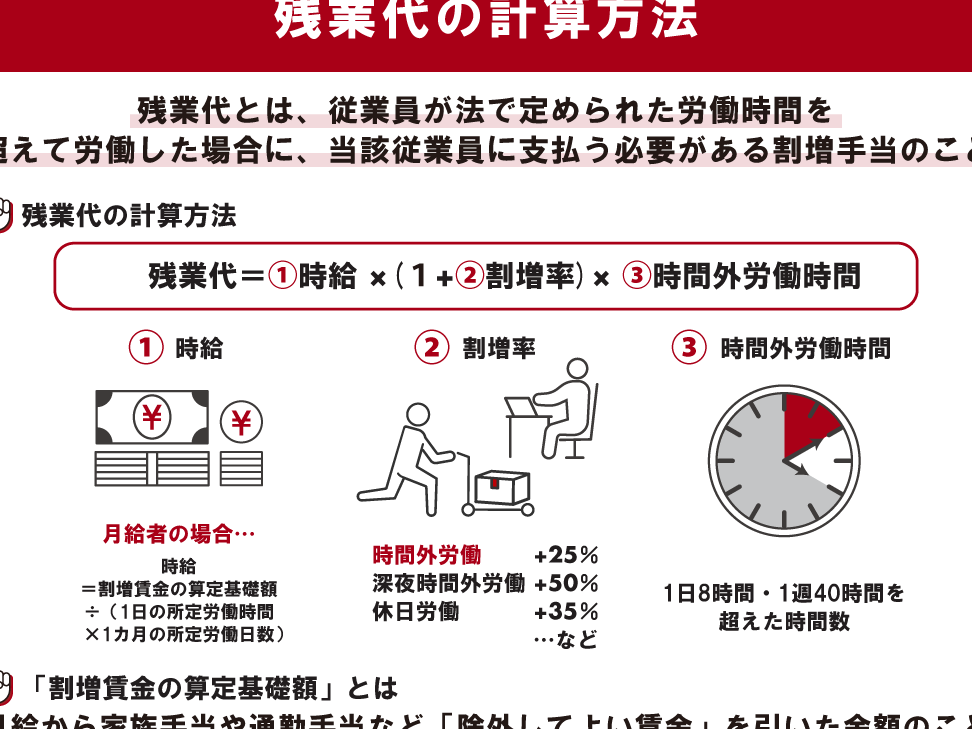 | 通常残業代率 | 基本給×1.25以上(通常時) |