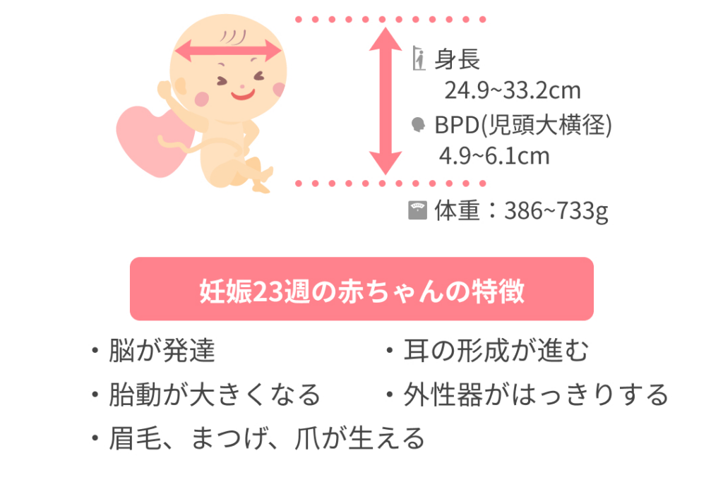 このようなデータからもわかるように、妊娠23週では赤ちゃんが着実に育っていることが確認できます。また、この時期には皮膚が薄くて透き通り始め、本格的な脂肪組織も形成されてきます。