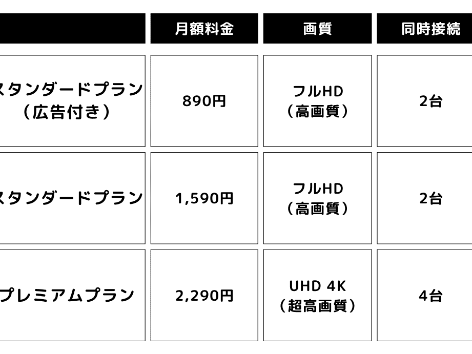 Netflixには主に3つの料金プランがあります。それぞれの特徴と料金は以下の通りです: