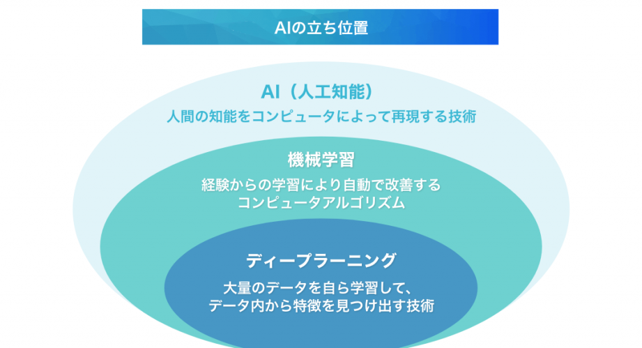 AIとは何かという問いには、「機械学習」や「深層学習」という専門用語も関連してきます。それぞれの違いと特徴について理解しておく必要があります。