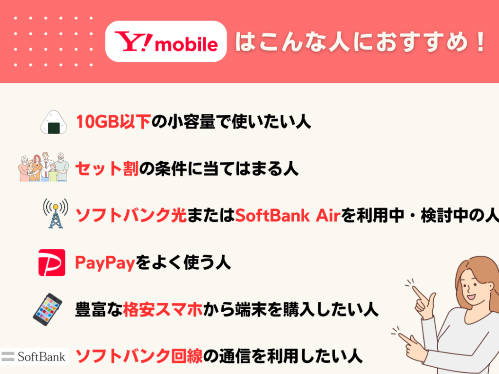 - リーズナブルな料金: ワイモバイルは、大手キャリアと比較して非常にお得なプランが揃っています。特に家族割引や長期利用者向けの特典も充実しています。