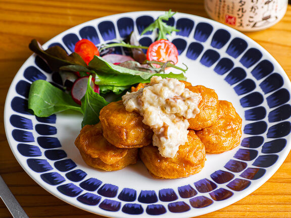 このレシピは、クリーミーなポテトサラダといぶりがっこタルタルの風味が絶妙にマッチします。