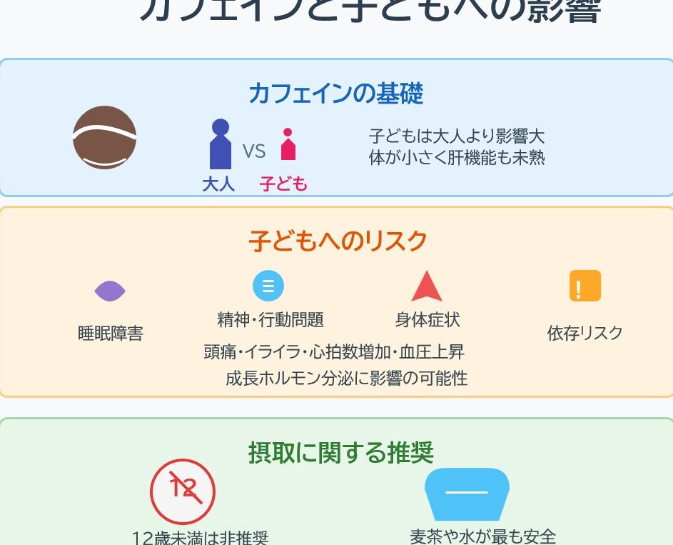 - 心身の健康へのリスク: 長期的には、高いカフェイン摂取が心臓の健康や成長発育にも悪影響を及ぼす恐れがあります。