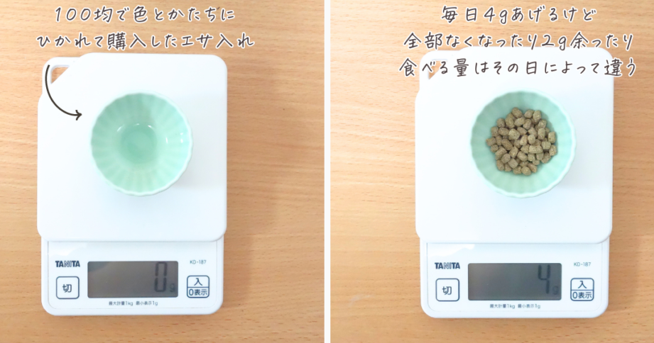 - 密閉容器の使用: 餌は湿気や虫から守るために密閉できる容器に入れて保管しましょう。プラスチック製やガラス製の容器がおすすめです。