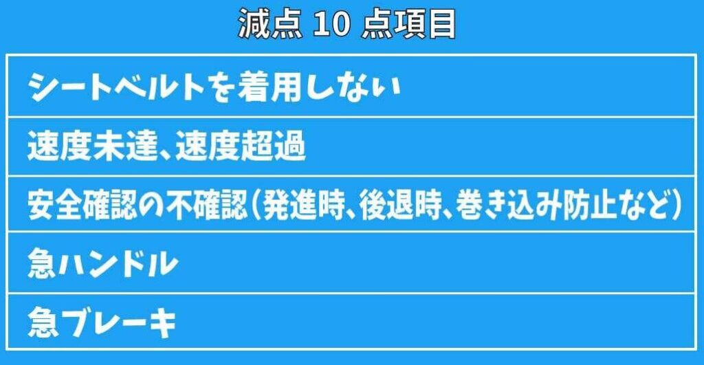 (この表は各テスト項目についてまとめています) 評価基準を理解することで、自分自身がどこで強化すべきか明確になり、戦略的学習につながります。このプロセスによって仮免合格点へ近づくことができるでしょう。