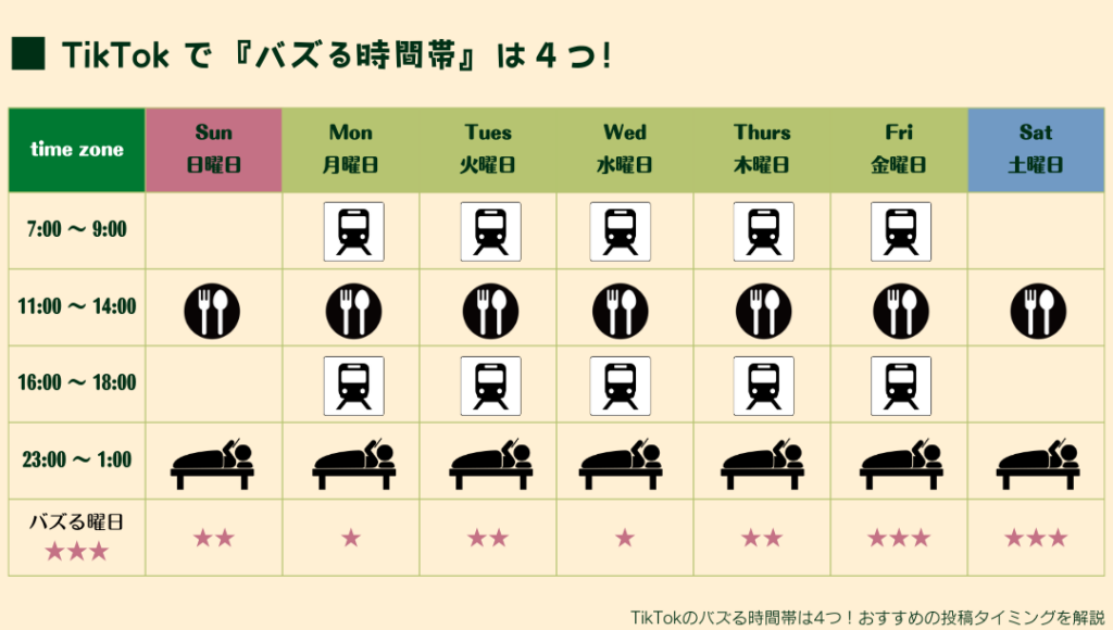 この表からわかるように、それぞれの日には異なる推奨投稿時間があります。この情報を基盤として、自分たちのコンテンツ戦略や投稿スケジュールを調整することで、より効果的なアプローチにつながります。そして、この知識こそが次回tiktokバズる時間につながる重要なカギとなります。