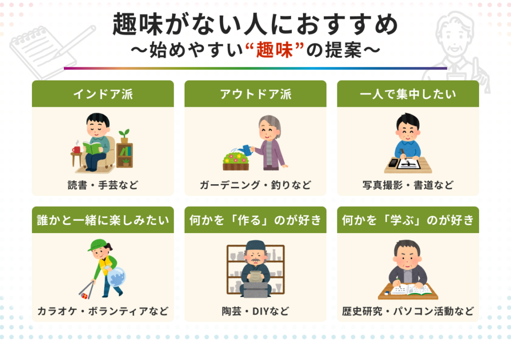 このように見てみると、「趣味がない人」は比較的一貫した生活パターンを持ちながらも、それぞれ異なる形で自分自身を豊かにする方法を見出しています。それでは次に、具体的な活動例について掘り下げてみましょう。