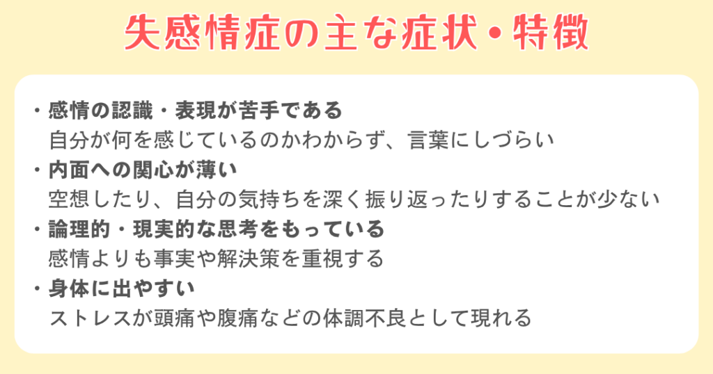失感情症の具体的な症状は多岐にわたり、個々の経験によって異なることがありますが、いくつかの共通した特徴があります。これらの症状は、日常生活や人間関係において大きな影響を及ぼす可能性があるため、注意深く観察することが重要です。