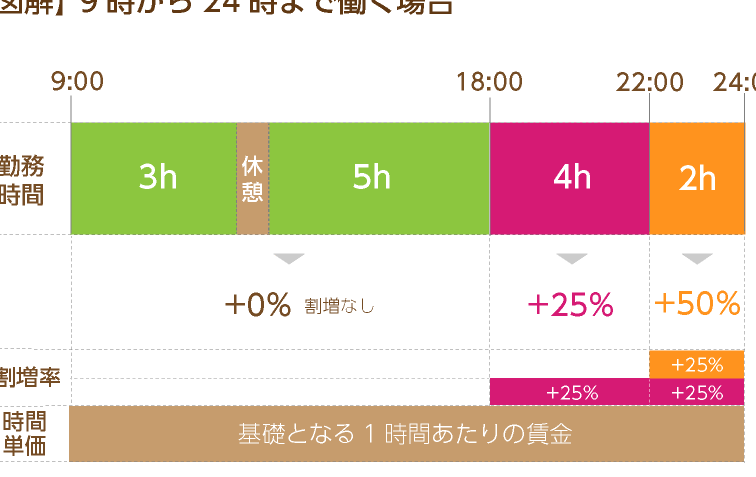 - 深夜(午後10時から午前5時)の勤務:25%の割増(通常の残業代に加算)