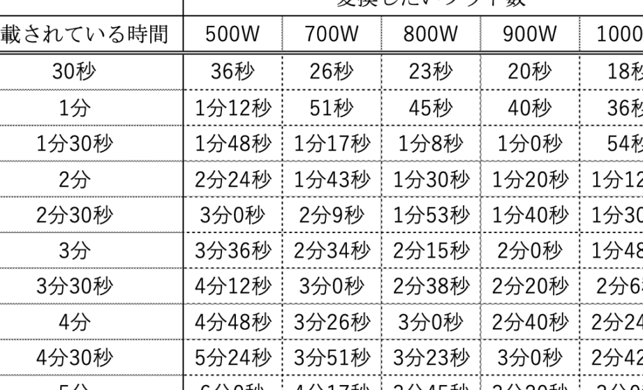 上記の表に示された通り、各食材にはそれぞれ異なる加熱条件があります。特に注意すべき点としては: