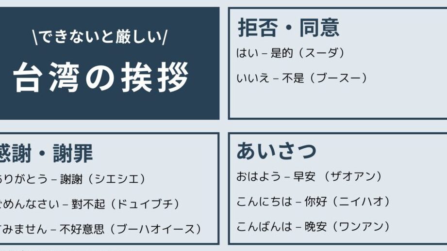 これらの言い回しは単なるフレーズ以上の意味があります。それぞれが台湾の文化や価値観を反映しており、私たちが他者とつながり、自分自身もその一員として受け入れてもらうために大切です。ぜひ実践してみてください。