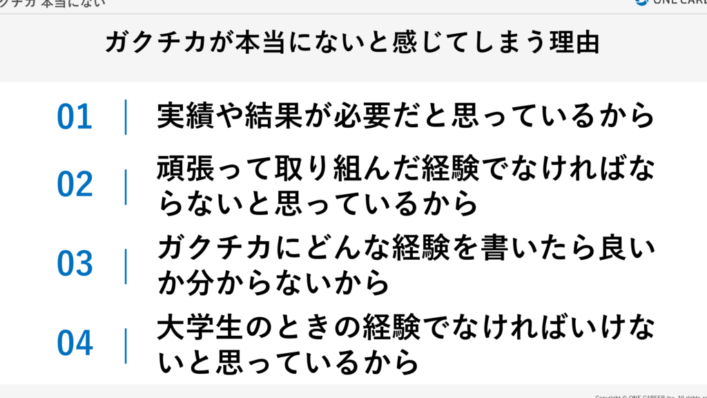 また、多くの学生は自分の日常的な活動やアルバイトなど、些細だと思われる経験さえも軽視してしまいます。しかし、小さな経験でも積み重なることで大きな力になります。それにもかかわらず、その価値に気づけないままでいると、「ガクチカ」は本当に存在しなくなるでしょう。