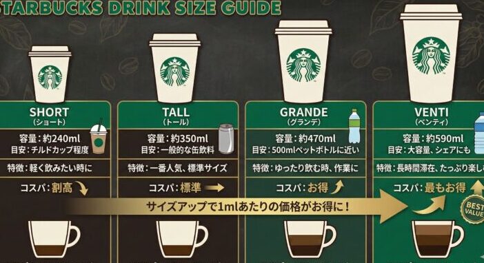 スタバの飲み物サイズは、それぞれ異なる容量を持ち、選ぶ際には自分の好みやシチュエーションに応じて最適なサイズを選ぶことが大切です。ここでは、各サイズの具体的な容量とその目安について詳しく見ていきます。この情報をもとに、自分にぴったりのスタバ飲み物サイズを見つけましょう。