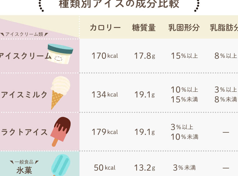 ここで示した数値は一般的なアイスクリームの例ですが、製品によって栄養成分には差があるため、購入時には必ずラベルを確認しましょう。また、高糖質・高脂肪のものばかり選ぶと、肥満や生活習慣病につながりやすいため注意が必要です。