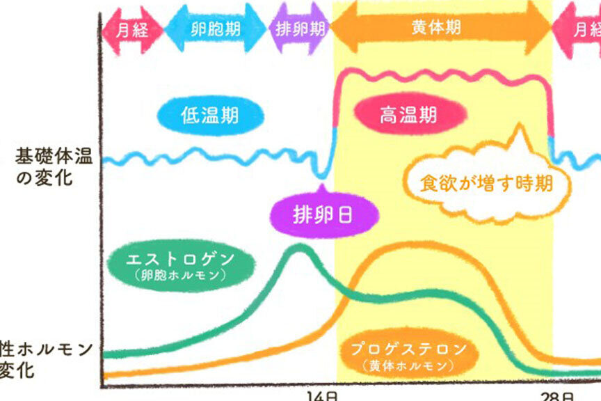 プロゲステロンは、生理周期中に排卵後に分泌され、その量が増加することで食欲を刺激します。このホルモンは、以下のような影響を持っています。