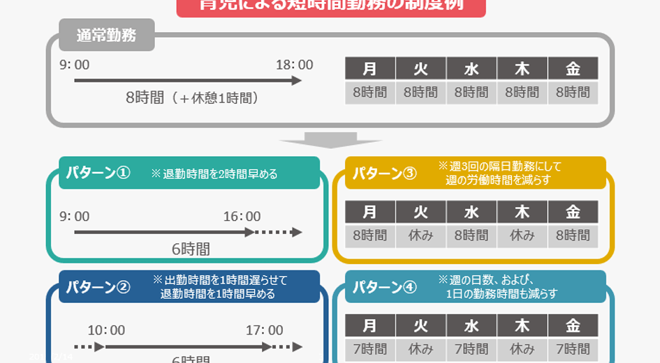- 実施例: 例えば、2020年4月1日に生まれた子どもの場合、その子どもは2026年3月31日まで育児短時間勤務を適用されます。