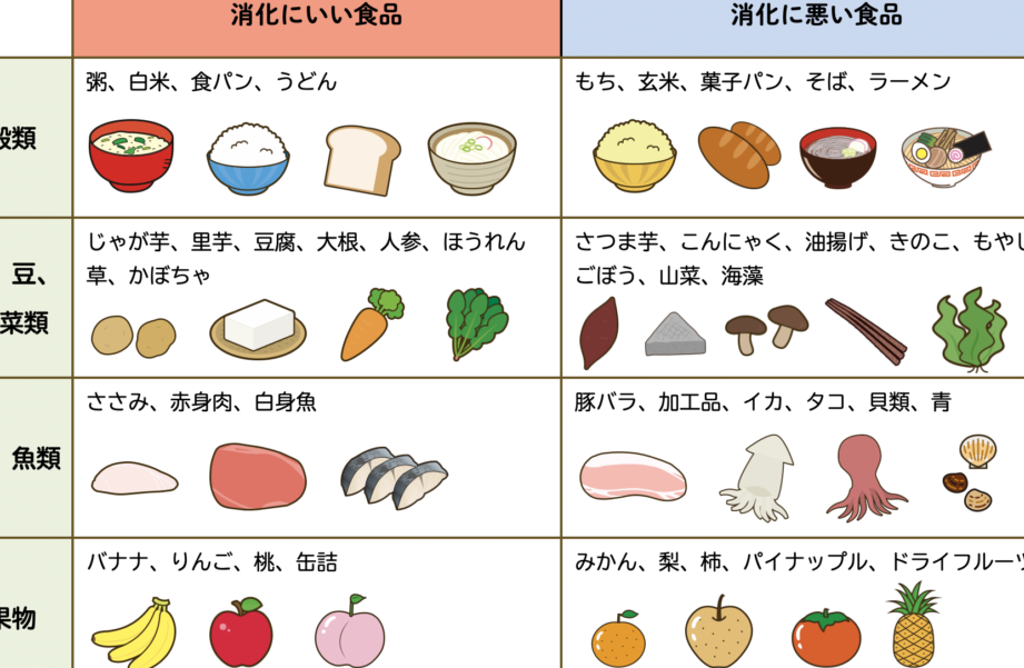 - バランスの取れた食事:栄養素が偏らないように、炭水化物、タンパク質、ビタミンやミネラルを意識して摂取します。特に消化に良い食品(おかゆや蒸し野菜など)を中心にメニューを組むことが大切です。