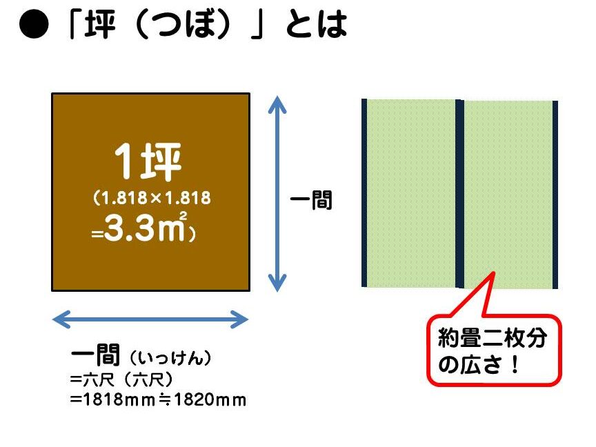 - 坪: 畳よりも広い面積を表す単位であり、1坪=約3.31㎡です。一般的には、家や土地などの不動産関連で多く使用されます。