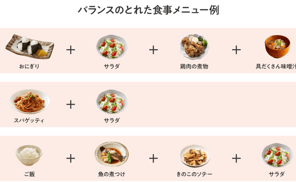 ダイエット中も他の栄養素とのバランスを考えることが肝心です。特に炭水化物やたんぱく質からも必須アミノ酸やビタミン・ミネラルを摂取する必要があります。例えば: