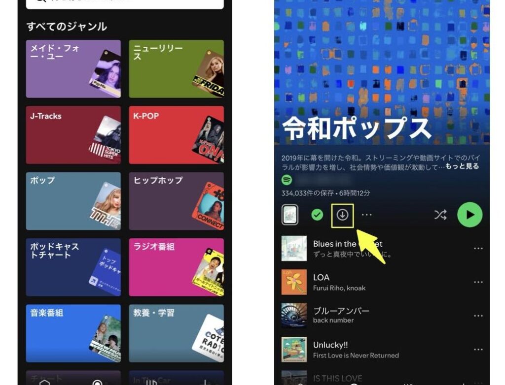 - プレイリストまたはアルバムを選択: オフライン再生したいプレイリストやアルバムを見つけてタップします。