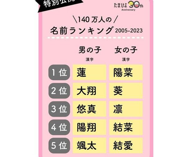 以下は、最新のデータから得られた日本で最も人気のある下の名前トップ10です。このリストは、新生児に名付けられた頻度によって決定されます。